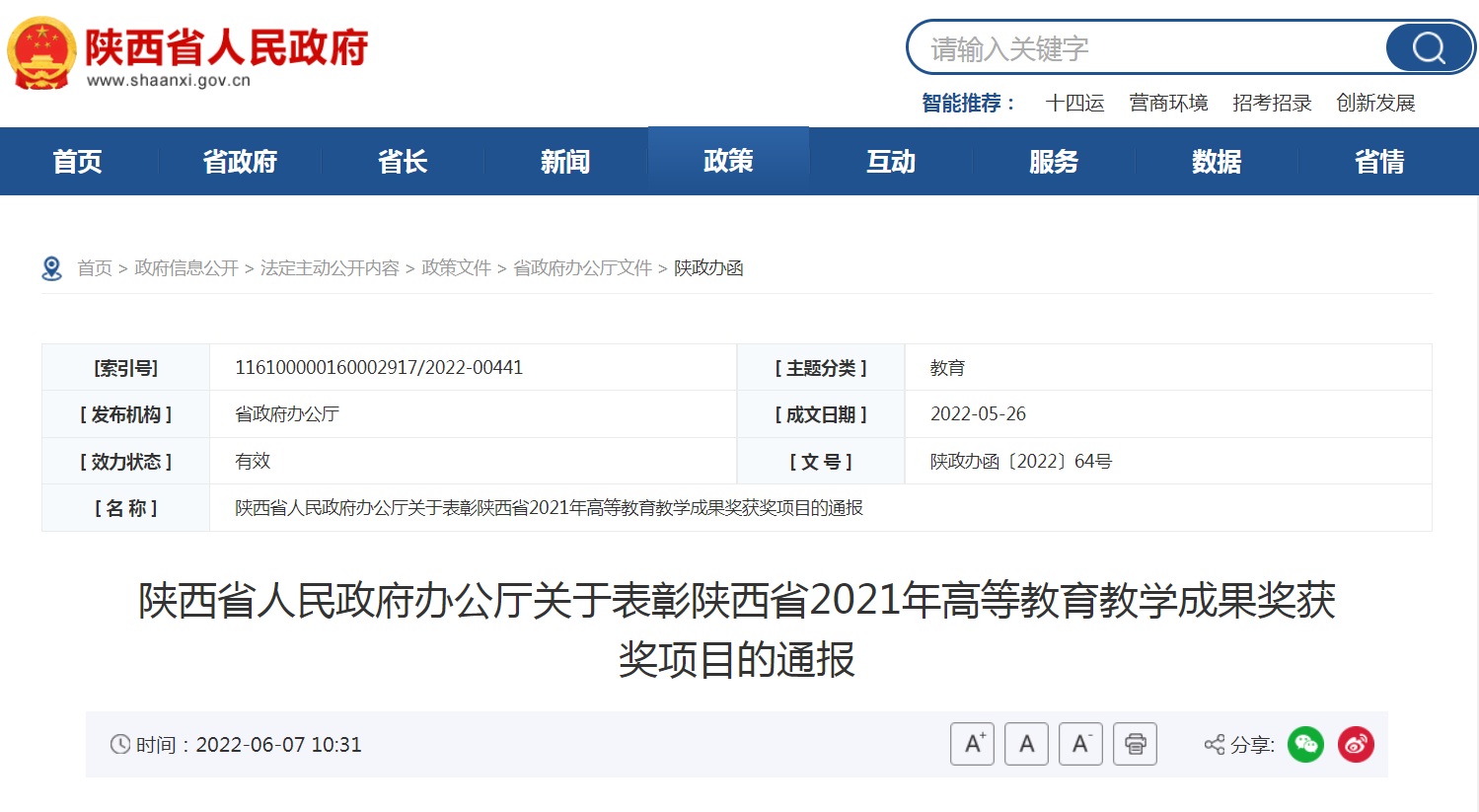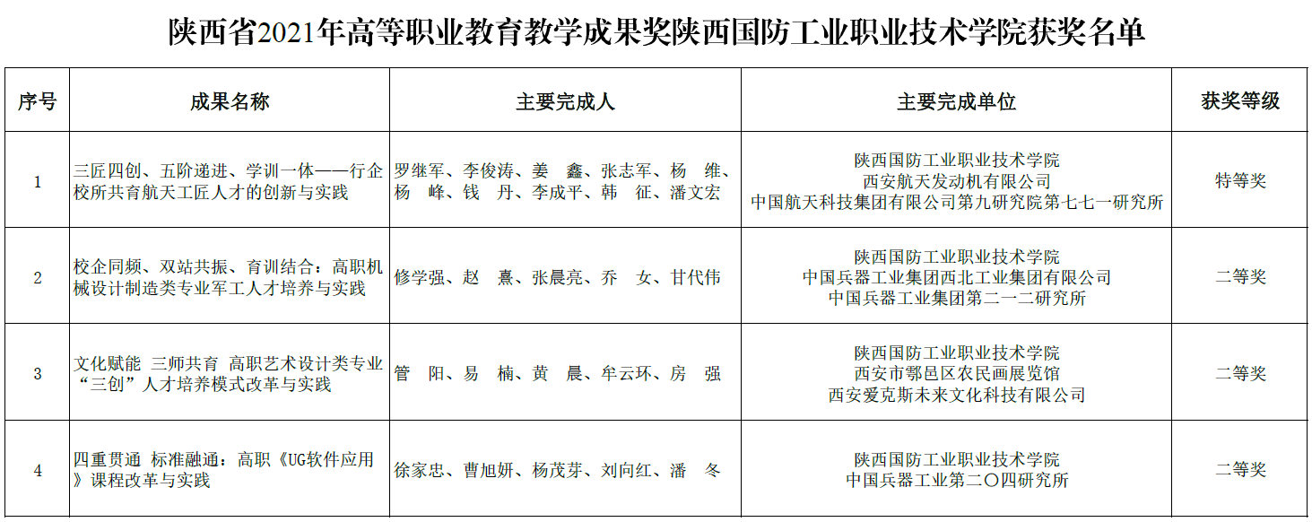 近日,陕西省人民政府办公厅发布了《关于表彰陕西省2021年高等教育教学成果奖获奖项目的通报》,betway必威中文正版4项成果荣获陕西省高等职业教育教学成果奖,其中特等奖1项、二等奖3项。