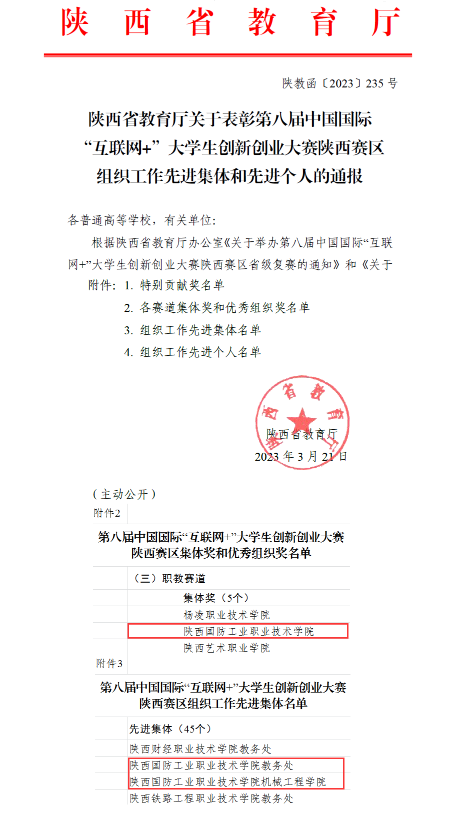 近日,陕西省教育厅对获得第八届中国国际“互联网+”大学生创新创业大赛陕西赛区组织工作先进集体和先进个人以及各赛道集体奖的单位进行了通报,我校荣获职教赛道先进集体,教务处、机械工程学院荣获组织工作先进集体,三名教师荣获组织工作先进个人。
