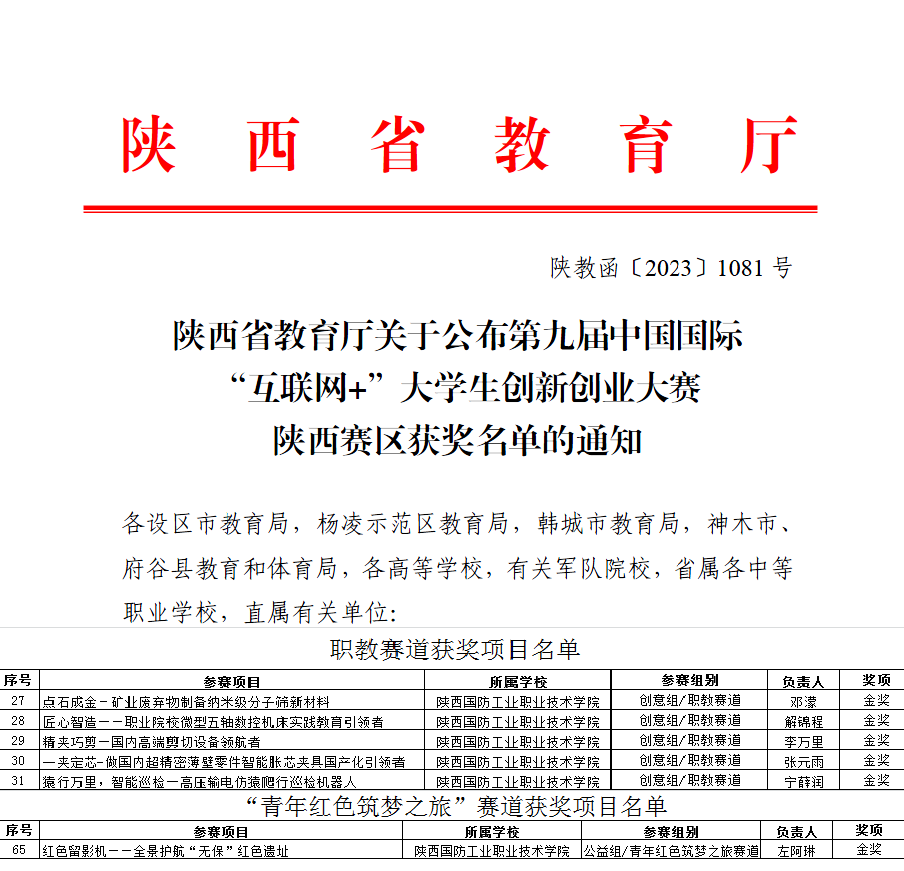 近期省教育厅公布了第九届互联网+大赛省级复赛获奖名单。我校在职教主赛道获奖31项,其中金奖5项、银奖13项、铜奖13项;“青年红色筑梦之旅赛道”获奖8项,其中金奖1项、银奖2项、铜奖5项。连续多届互联网+大赛省赛金奖数位居陕西省前列。