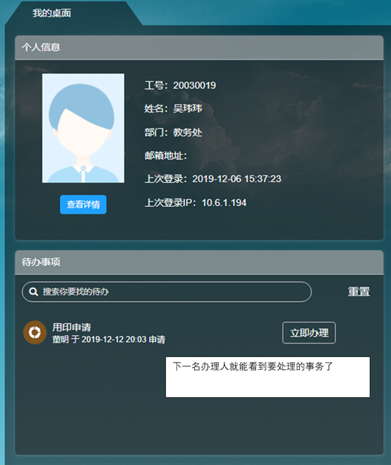 交完成后,下一个办理人就可以在他的一站式办事大厅中看到办理事项了。