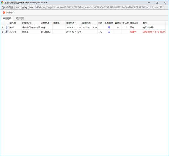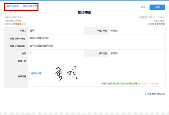 1. 在事务申请页面单击“查看流程图”,可以看到该事务的流程步骤,单击“查看流转记录”,可以看到该事务已经完成的流转记录。