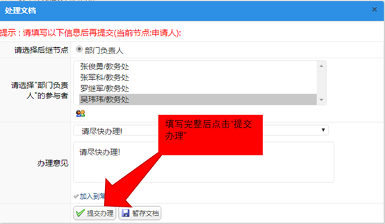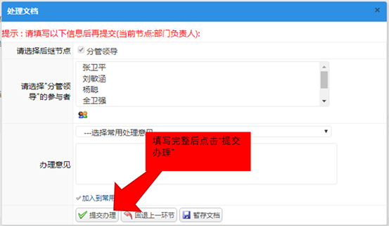 然后单击“办理”按钮,在新弹出的页面中选择“后续节点”和后续节点负责人,可以直接从列表中选择,或点击图标,在人员列表中选择下一步处理人。填写处理意见,然后点击“提交办理”按钮。