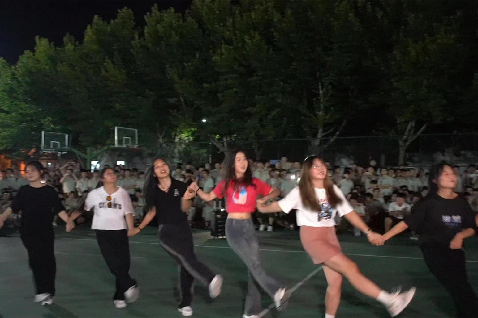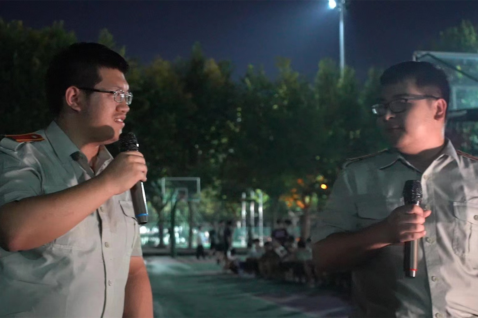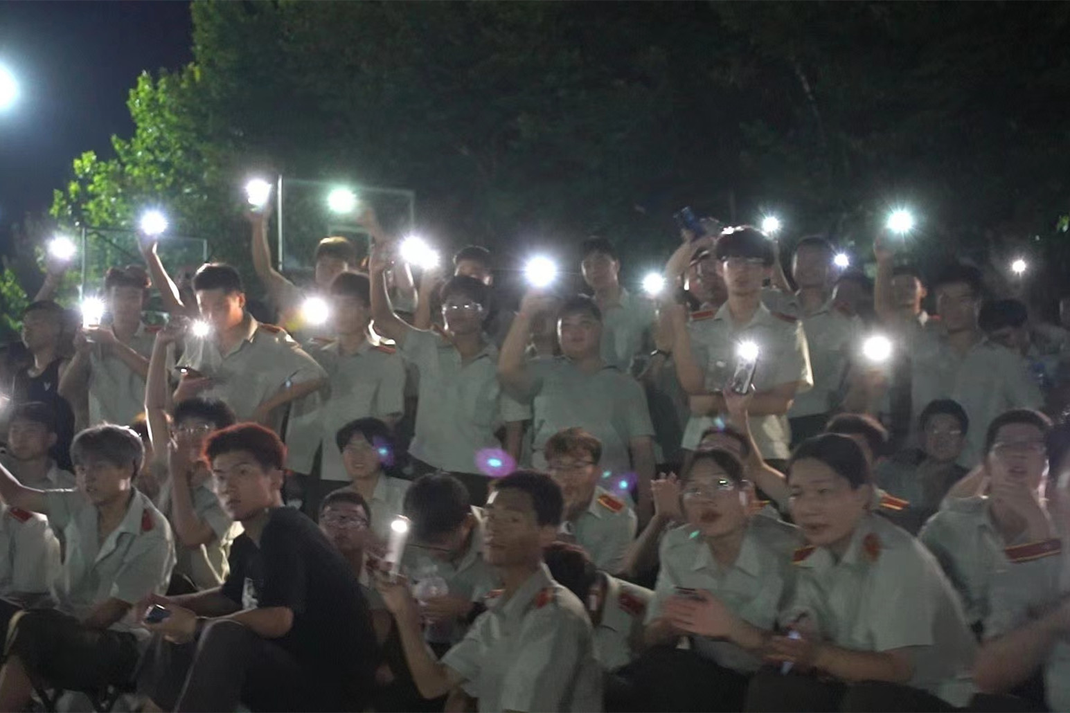 暮色降临,军训学生在教官的带领下汇集在篮球场上