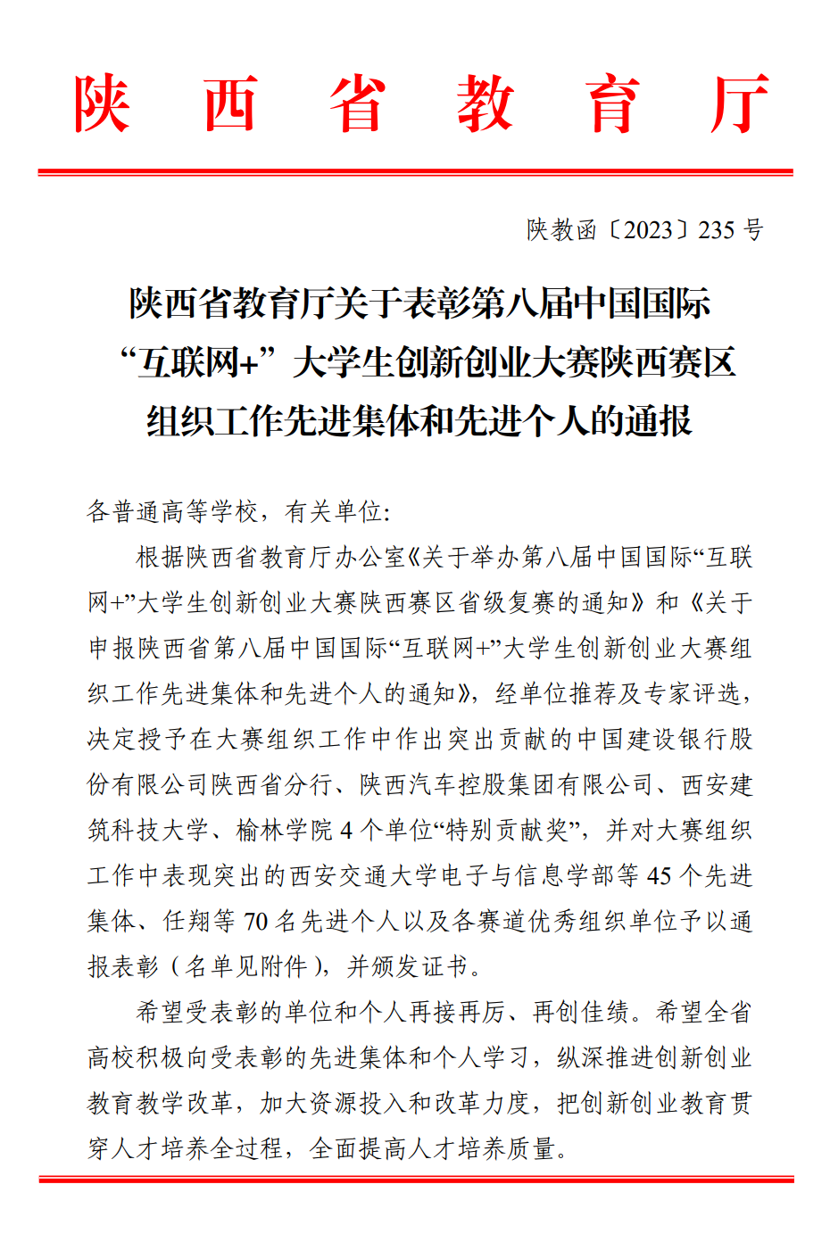 近日,陕西省教育厅表彰了第八届中国国际“互联网+”大学生创新创业大赛陕西赛区组织工作先进集体和先进个人,我校机械工程学院获得陕西赛区组织工作先进集体。本次大赛共表彰包括西安交通大学电子与信息学部在内的先进集体共45个。