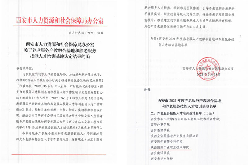 近日,西安市人力资源和社会保障局公布了养老服务产教融合基地和养老服务技能人才培训基地认定结果,我校成功获批西安市养老服务技能人才培训基地。
