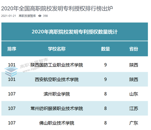 近日,“高职发展智库”发布了“2020年全国高职院校发明专利授权排行榜出炉”,我校2020年共获得国家发明专利授权9件,位居陕西高职第一(与西安航空职业技术学院并列)。