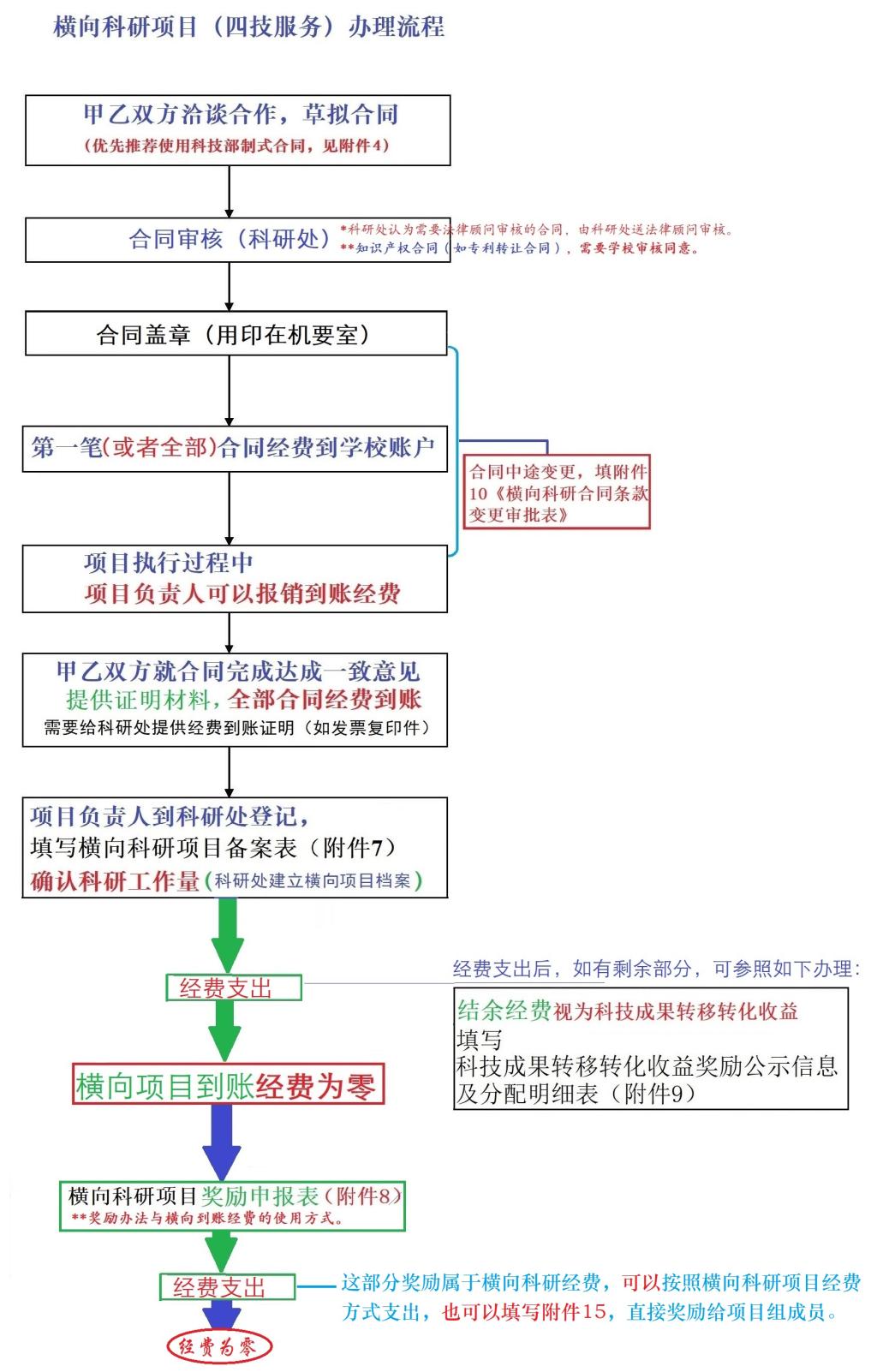 10 对于项目完成以后,剩余的横向项目经费,(可以视为科技成果转移转化收益,经项目负责人申请)奖励给项目组成员。填写附件9《科技成果转移转化收益奖励分配公示+奖励分配明细。附件9仅适用于2021年1月1日后签订的四技合同。2020年12月31日前签订的四技合同,科技成果转移转化收益奖励分配仍执行当时的文件,具体执行方式和科研处联系。