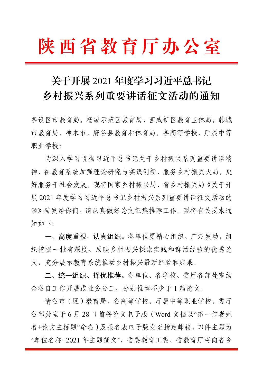 陕西省教育厅办公室“关于开展2021年度学习习近平总书记乡村振兴系列重要讲话征文活动的通知”文件如下,请各位老师踊跃参加。