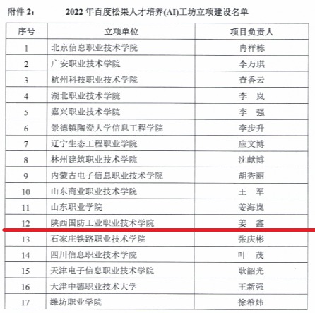 根据中国高职高专教育网公示信息“关于公布2022年百度松果学堂高校合作项目资助计划立项建设名单的通知”,我校荣获全国首批25家百度松果人工智能人才培养(AI)工坊立项建设单位。
