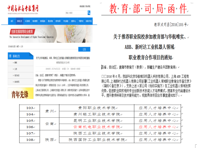 此次教育部公布华航唯实、新时达、ABB工业机器人领域职业教育项目合作院校名单,全国共有115所职业院校入围,我院列入榜单,正式成为教育部与华航唯实、新时达、ABB工业机器人领域职业教育项目合作成员单位。工业机器人领域职业教育项目是教育部牵头组织的大型校企合作项目。2016年6月,教育部与北京华航唯实机器人科技有限公司、上海ABB工程有限公司、上海新时达机器人有限公司签署《工业机器人领域职业教育合作备忘录》(简称《备忘录》),支持上述3家公司(统称实施方)在工业机器人领域发挥优势,促进职业院校相关专业创新技术技能人才培养模式,提高专业内涵建设水平,提升教师科研及技术服务能力。