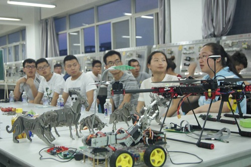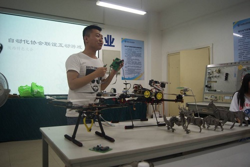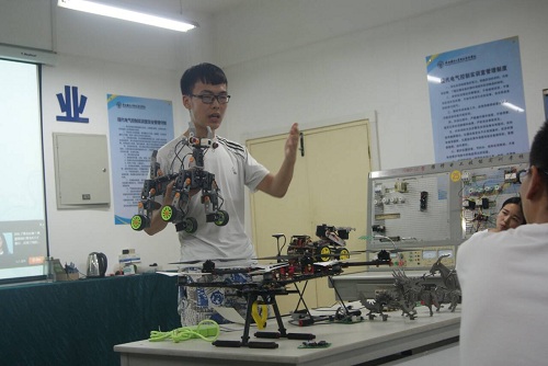 首先由自动化协会展示了四个产品:分别是超声波测距仪,智能台灯,温度报警器以及彩灯控制产品,由自动化协会副会长贺惠隆和卫江给大家详细介绍了产品的制作过程,以及功能、作用等特点;航模协会会长淡煦嘉介绍了四翼无人机的相关特点,为大家进行了航模表演;机电协会张国良展示了在第十一届西安高新“挑战杯”陕西省大学生课外学术科技作品竞赛中获得二等奖的机器狗,并给大家介绍了机器狗的相关功能;特种加工协会李植展示了机械版的“十二生肖”,并为大家介绍了线切割技术的应用。