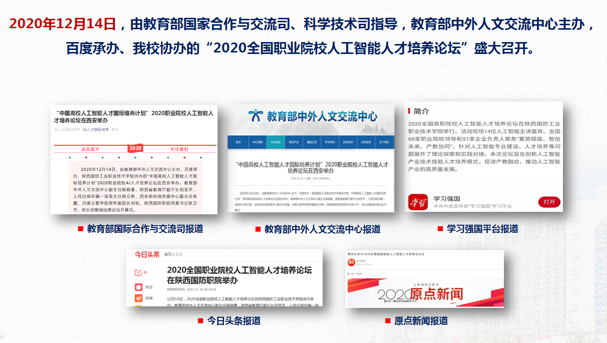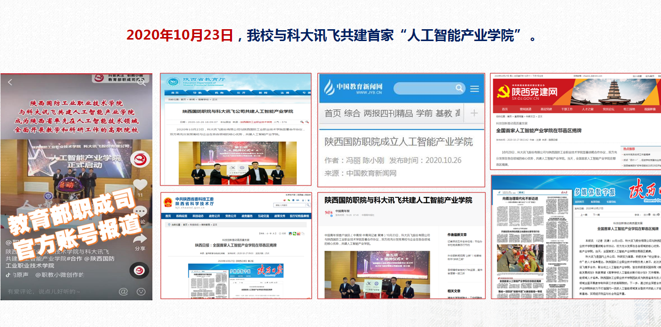 2020年,我院积极响应国家“产学合作育人”的号召,联合西安软件新城牵头成立了“全国人工智能职业教育产教协同创新联盟”,发起成立了中国物联网产教融合联盟;成功举办了由教育部国际交流与合作司、科学技术司主办的“2020全国职业院校人工智能人才培养论坛”,先后与20余家企业探索校企协同共育人才的新模式,与科大讯飞共建国内首家“人工智能产业学院”、与百度共建全国首家“智能工业网联产业学院”、与君晖航空共建“现代无人机产学研基地暨联合创新中心”。