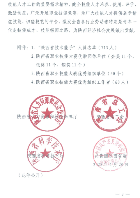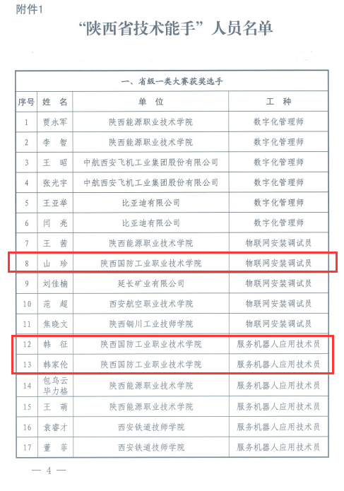 根据陕西省人力资源和社会保障厅、陕西省总工会、陕西省科学技术厅、共青团陕西省委的表彰文件精神,我校人工智能学院山珍、韩征、韩家伦三位教师被授予“陕西省技术能手”荣誉称号,并按照规定由人社厅办理晋升职业技能等级和相关职业资格证书。