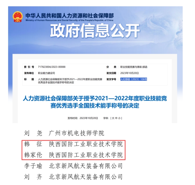 近日,人力资源和社会保障部发布了《人力资源社会保障部关于授予2021—2022年度职业技能竞赛优秀选手全国技术能手称号的决定》(人社部函〔2023〕106号),我校人工智能学院韩征、韩家伦两位教师荣获“全国技术能手”荣誉称号。这一荣誉为我校技能人才培养方面取得的最高荣誉,标志着我校高端技能人才培养、技术创新和师资水平迈上新台阶,这是我校在教育教学领域取得的又一项重要成果,充分展示了我校教师的专业素质和技能水平。