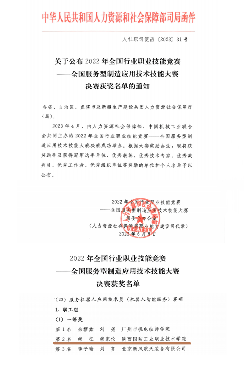 2023年4月,人工智能学院韩征、韩家伦两位老师,参加了由人力资源和社会保障部主办的国家一类职业技能大赛“2022年全国行业职业技能竞赛——全国服务型制造应用技术技能大赛”,校长刘敏涵教授亲临竞赛现场指导,荣获全国一等奖,按大赛文件规定授予“全国技术能手”荣誉称号,这一成绩实现了我省在此类赛事上“零”的突破,取得了我省参加国家级一类大赛历次最好成绩和最高奖励,陕西省人力资源和社会保障厅领导专程来我校颁授贺信,先后被陕西省人民政府网、陕西日报等媒体进行了相关报道。