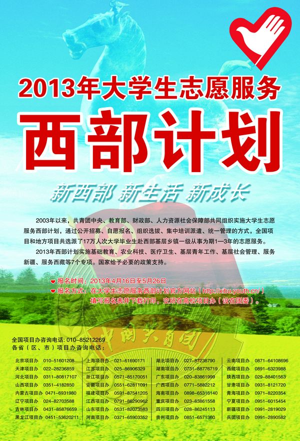 2013年西部计划志愿者招募工作已于4月16日正式启动。高校应届毕业生可在大学生志愿服务西部计划官方网站(http://xibu.youth.cn/)如实填写报名表,并选择三个意向服务省。下载打印后,经辅导员签字、所在院系盖章,交所在高校项目办(设在团委)审核备案。