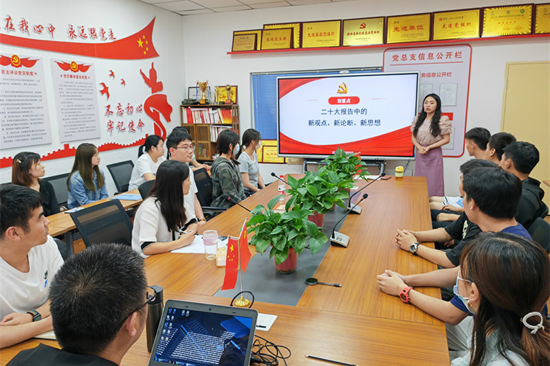 本次党课贾媛媛同志主要从习近平总书记在党的二十大报告中提出的一系列新观点、新论断、新思想、新战略、新要求出发,讲解了党的二十大报告中蕴含的丰富内涵,阐述了坚持和加强党的全面领导,坚持中国特色社会主义道路,坚持以人民为中心的发展思想,坚持深化改革开放,坚持发扬斗争精神的重要性和必要性。