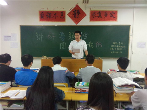机电学院团总支组织各班团支部认真学习《关于开展推广普通话宣传周活动的通知》文件精神,创新设计团日活动开展形式。根据各年级实际情况,分年级组织此次活动:(一)组织大二学生开展汉字听写大会。(二)组织大三学生开展诗歌朗诵比赛。为了营造推普气氛,我院大力宣传,广泛动员。在校园内醒目位置悬挂宣传横幅“说普通话写规范字做文明人”。