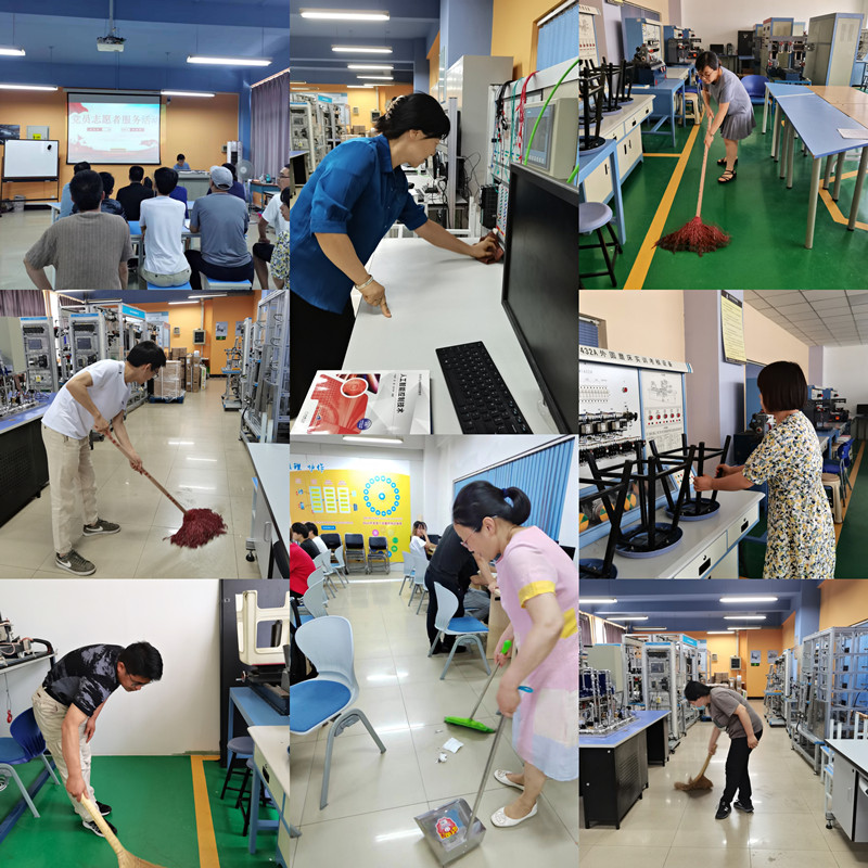 6月21日下午五点半,教师党支部全体党员在8-208集合,大家先集中领会了此次活动的重大意义,然后,大家分组对电气维修、可编程控制、智能供配电、智能仿真等实验实训室进行了彻底的卫生打扫,并进行了安全隐患大排除。