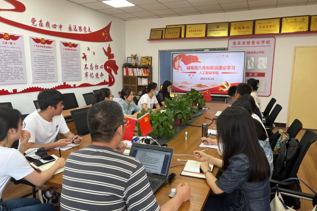 为深入推进学习贯彻习近平新时代中国特色社会主义思想主题教育,为提高我院学工队伍综合素质,进一步提高我院辅导员业务能力,正确处理学生伤害事故,更好地完成立德树人根本任务,更切实际地做好服务教育管理工作,引导学生成长成才,人工智能学院于6月29日下午16:50在8-209开展全体专兼职辅导员政治理论学习,本次学习会由人工智能学院学生科科长刘沛静主持,全体专兼职参加此次学习会。