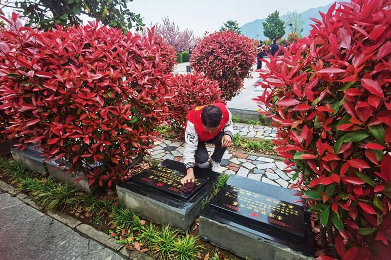 青年代表们纷纷感叹于为了祖国牺牲自己的一个个年轻的生命,主动争抢拿起笤帚、抹布,打扫起陵园的墓碑。他们轻轻地拭去烈士墓碑上的浮尘,扫去碑前的尘土,摆放好墓碑上的鲜花,让革命精神永放光芒。