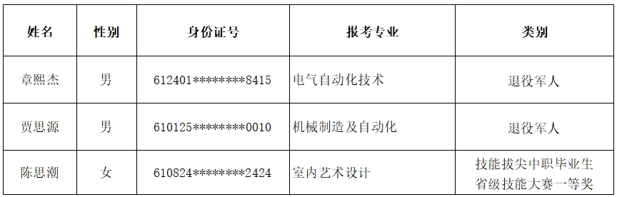 2024年单招免笔试退役军人及技能拔尖免试入学考生名单