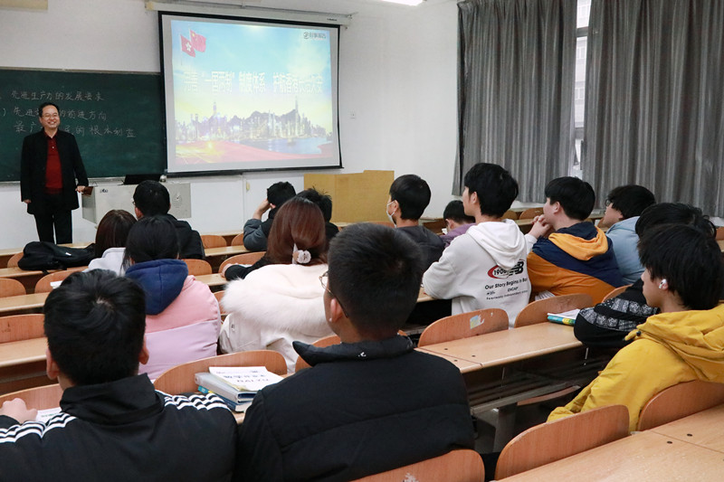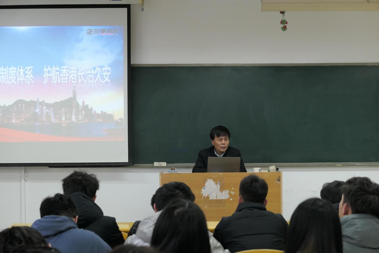 校长刘敏涵,分别以“完善‘一国两制’制度体系 护航香港长治久安”“共同构建人与自然生命共同体”为题,为电子信息学院学生讲授了形势与政策课,他以香港的历史及回归来的发展变迁引入,从“国安法施行,香港实现‘由乱及治’完善选举制度,确保‘爱国者治港’坚定制度自信,完善‘一国两制’”三个维度,系统讲授了完善“一国两制”对于香港繁荣稳定发展的重要性,引导学生们对香港国安法、“爱国者治港”重要原则进行深刻理解和认识。