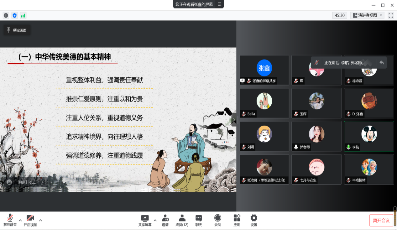 本次集体备课会由张鑫老师围绕《思想道德与法治》第五章第二节内容,以“中华传统美德的创造性转化和创新性发展”“中国革命道德的当代价值”为重点,运用疫情中展现的中国精神、中国力量、中国担当,引导学生学史力行,知行合一。