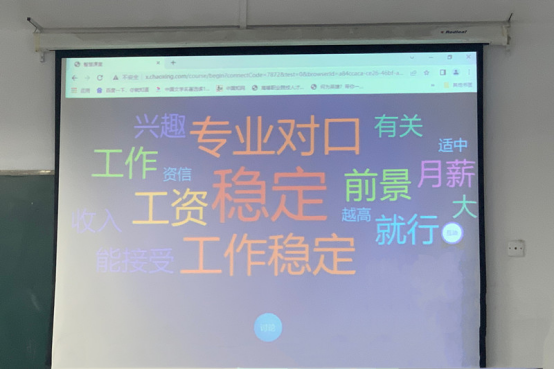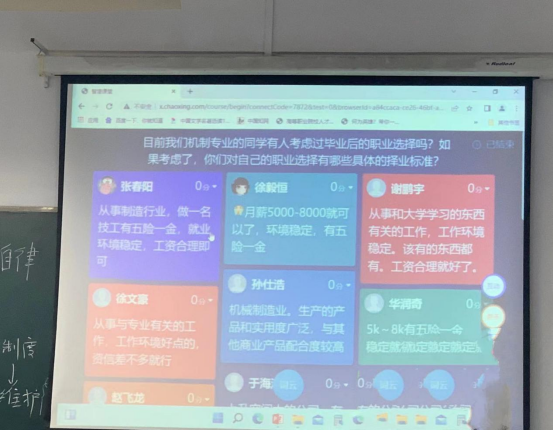 刘娟老师深入了解学情,认真设计教学环节,引导学生主动认知职业与劳动之间的关系,与学生共同探索机制专业学生在学校期间如何培养自身的职业道德。刘老师首先通过学习通设置的问卷调查引导学生认识职业与劳动之间的关系,随后通过随机提问进一步让学生体会到劳动的意义和价值,再通过随堂练习活动总结劳动价值观,让学生树立只有通过诚实劳动、辛勤劳动才能实现自己的职业理想。在职业道德讲授环节中通过让学生分享实习实训中的感受,从学生的发言中抓取核心词汇,再对比“工匠精神”内涵要求,引导学生从现在开始用工匠精神要求自己,主动培养工匠品质,将职业道德和工匠品质的培养融入到日常的学习和实训中,鼓励学生做新时代国家建设的中流砥柱。