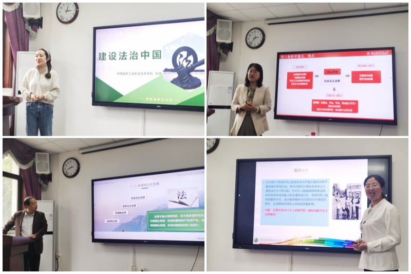 随后,三位教师就第六章的重点内容分别进行了教学展示。杨陵职业技术学院樊维聪老师就“法律的历史发展”部分内容进行了深入细致的讲解,他引用丰富的历史材料对不同时期的法律特征进行了具体说明,重点阐述了为什么社会主义法律是为历史上各种类型法律制度的超越;我校马院思法教研室张静老师就“建设法治中国”部分内容进行了展示,她围绕着三个核心问题“什么是法治”“为什么选择法 治”“为什么走中国特色社会主义法治道路”进行了深入浅出的讲述,其运用丰富的课堂互动,将晦涩呆板的法律知识进行活灵活现地呈现出来,使与会教师感到耳目一新;西北农林科技大学张丽老师就“法治思维的基本内容”进行了教学展示,其运用丰富恰当的时下案例,将知识点串联起来,使参会教师获益匪浅。