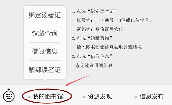 点选公众号界面右下角“我的图书馆”,进行帐号绑定、借阅及馆藏信息查询。