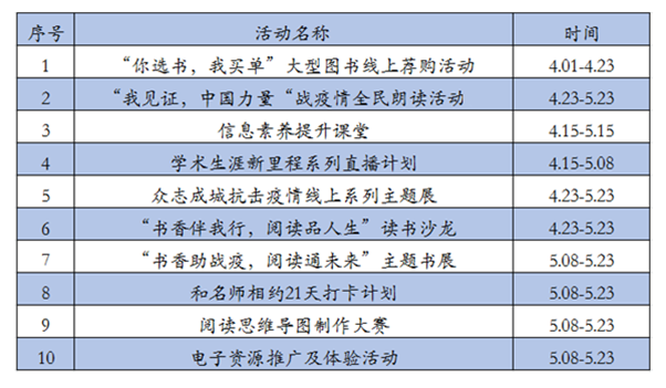 本次读书月活动面向全院师生,围绕战疫情、资源建设、阅读推广、电子资源推广、信息素养教育以及服务教学和科研等主题,将陆续举办 “你选书,我买单”线上大型图书荐购活动、“我见证,中国力量“战疫情全民朗读活动、信息素养提升课堂、学术生涯新里程系列直播计划、众志成城抗击疫情线上系列主题展、“书香伴我行,阅读品人生”读书沙龙、“书香助战疫,阅读通未来”主题书展、和名师相约21天打卡计划、阅读思维导图制作大赛以及电子资源推广及体验活动等10项活动。