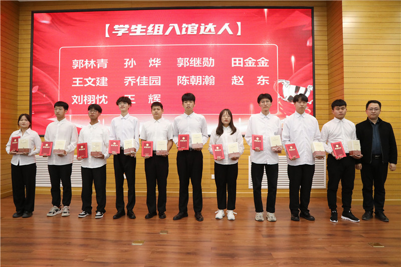团委书记张钊为荣获学生组“入馆达人”称号的读者颁发证书和奖品
