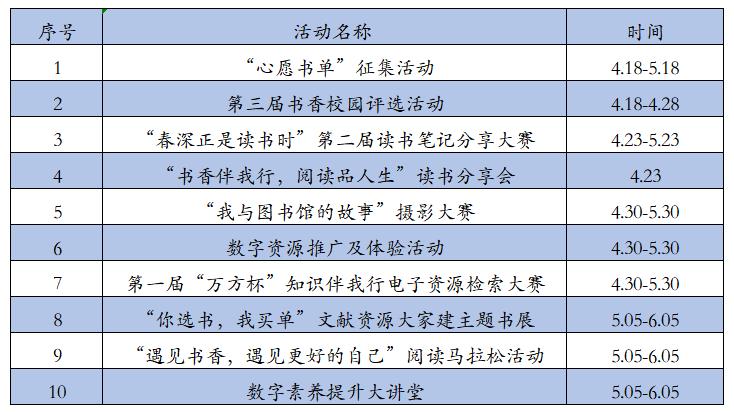 本次读书月活动面向全院师生,围绕资源建设、阅读推广、电子资源推广、数字素养提升、信息素养教育以及服务教学和科研等主题,将陆续举办“心愿书单”征集活动、第三届书香校园评选活动、“春深正是读书时”第二届读书笔记分享大赛、“书香伴我行,阅读品人生”读书分享会、数字资源推广及体验活动、“我与图书馆的故事”摄影大赛、“遇见书香 遇见更好的自己”阅读马拉松活动、“你选书,我买单”文献资源大家建主题书展、第一届“万方杯”知识伴我行电子资源检索大赛以及数字素养提升大讲堂等10项活动。
