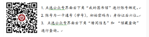 7.读者如需查询个人借阅信息、馆藏信息、馆内推广活动及最新通知,请关注图书馆公众号。