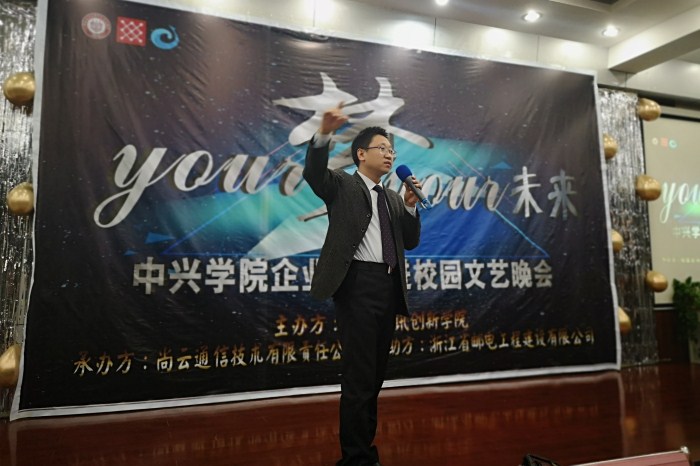 11月16日,为加强中兴学生提高职业素质,了解相关行业、企业,展现我校中兴学院学生的才艺,我校与中兴学院的虚拟公司-尚云通信技术公司和浙江邮电工程建设公司,共同举办了丰富多彩的企业文化进校园文艺晚会,晚会在教二报告厅举行。院长刘敏涵,教务处、团委等教师,以及中兴学院的广大师生观看了本次文艺晚会。晚会还邀请了上海安畅网络公司、上海思华科技有限公司的相关企业领导共同参加。
