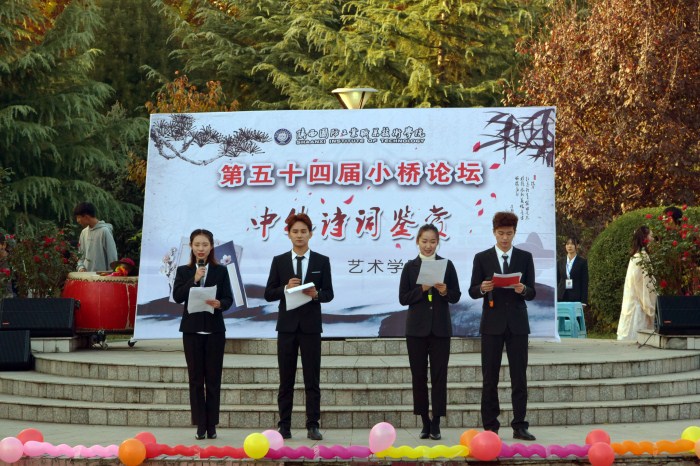 为了进一步丰富校园文化生活,引领大学生阅读中华经典诗文,提高大学生的语言文学素养,展示我校学生青春活力精神的风貌,提高学生的文学修养。11月8日下午4:30,艺术学院在犀月湖畔举办了我校第54期“中外名著古典诗词鉴赏诵读大会 ”小桥论坛。参加出席本次活动的嘉宾有经济管理学院党总支书记王占祥,机械工程学院党总支书记杨晓平,艺术学院副院长党总支副书记管阳,汽车工程学院学生科科长张帆,电子工程学院学生科科长赵鹏,机械工程学院学生科科长沈博,学生处寇晓晶老师,团委周心怡、范爽老师,建筑与热能学院王帅老师及艺术学院全体老师代表观看了这场文化盛宴。