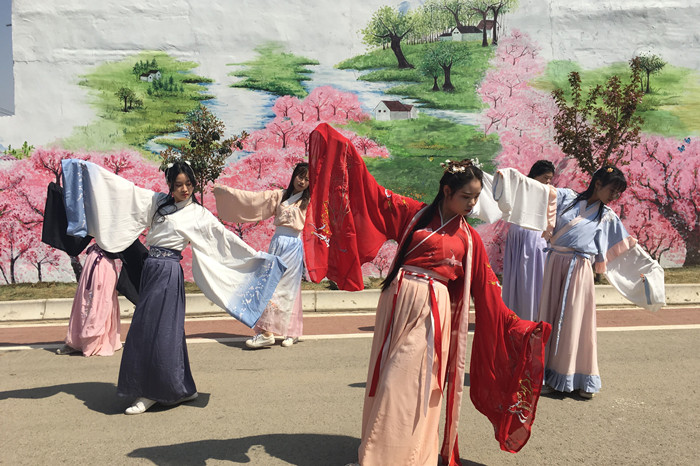 活动现场,万亩桃花竞相开放,游客仿佛进入了漫山遍野的桃花仙境。我校学生身着汉服,穿梭在盛开的桃林中,领略古风汉服,欣赏十里桃花。活动中,我校蒹葭汉文化协会表演了古典舞《礼仪之邦》和《玉生烟》,优美的舞蹈引来大批游客驻足观赏。