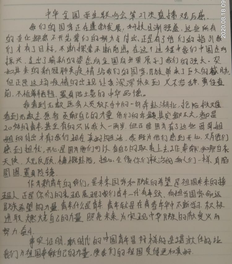 时值暑假,我校青年学生尚未返校,分散在各地,有的同学还在暑期实践中,但在各团总支的积极号召下,及时观看纷纷响应,并向团组织发来直播活动的观后感言。