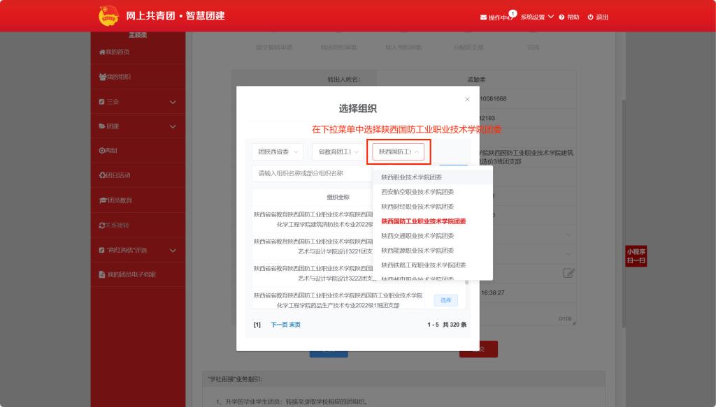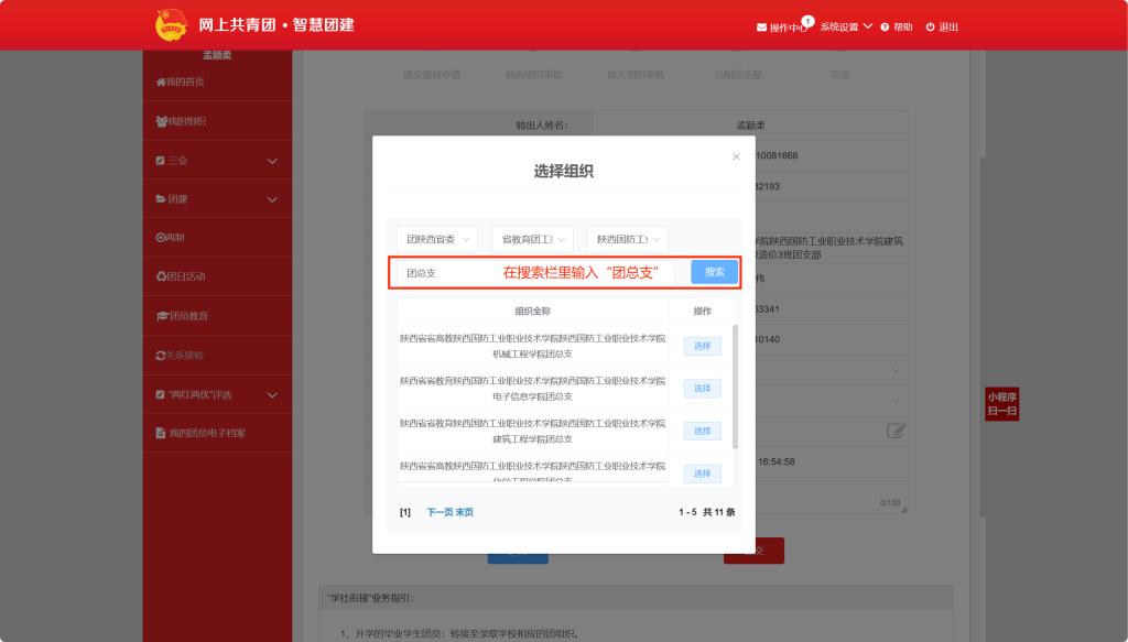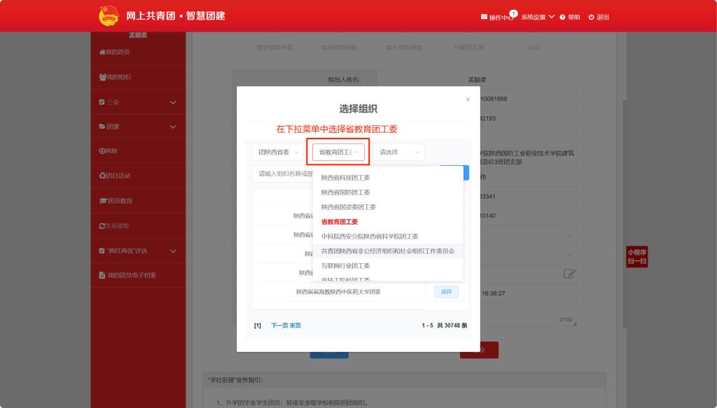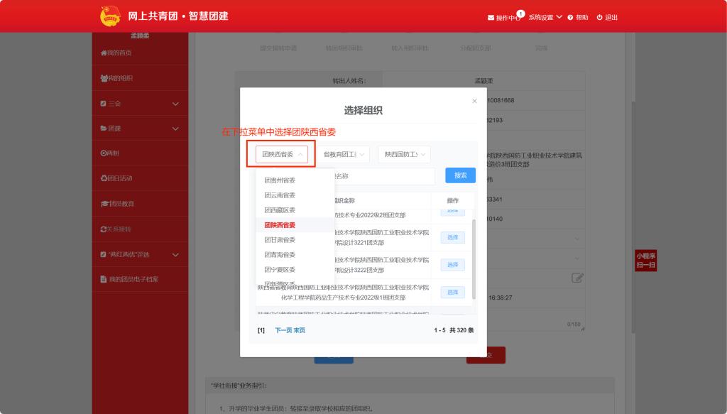 申请转入组织:搜索组织的时候,三个框进行选择分别是: