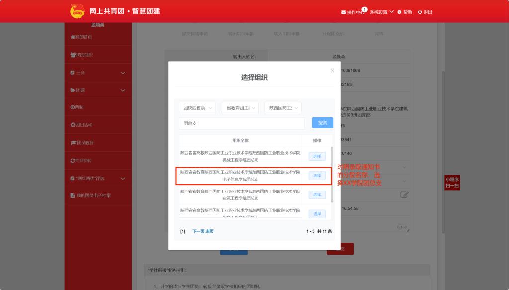 2.一定要选择上图所标记的分院团总支,不要选择列表下半部分的班级团支部。