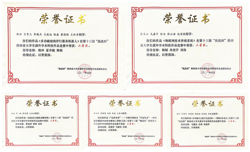 2021年5月22日,由团省委、省委教育工委、省科协、省社会科学院、省学联共同主办,陕西师范大学承办的第十三届“挑战杯”陕汽集团陕西省大学生课外学术科技作品竞赛闭幕式暨颁奖仪式在陕西师范大学终南音乐厅举行。我校师生10个参赛项目脱颖而出,代表学校参加此项赛事省级比赛,经过层层角逐、激烈竞争,最终荣获银奖2项、铜奖3项。