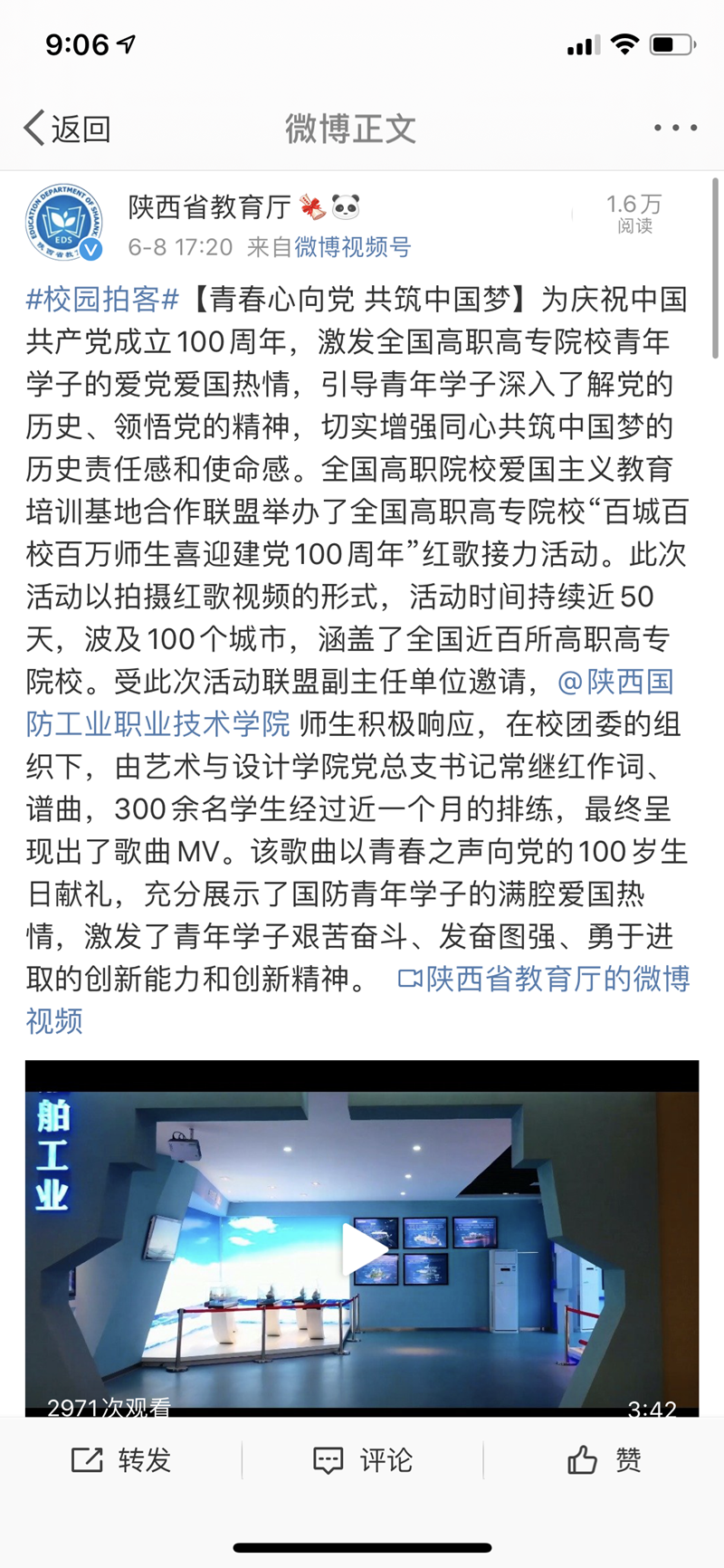6月8日,陕西省教育厅记者从betway必威中文正版(以下简称陕西国防职院)获悉:为庆祝中国共产党成立100周年,激发全国高职高专院校青年学子的爱党爱国热情,引导青年学子深入了解党的历史、领悟党的精神,切实增强同心共筑中国梦的历史责任感和使命感。陕西国防职院参与全国高职院校爱国主义教育培训基地合作联盟举办的全国高职高专院校“百城百校百万师生喜迎建党100周年”红歌接力活动。