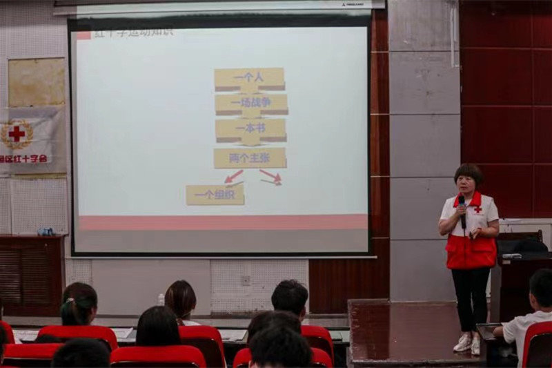 ——急救知识培训。赛会志愿者直接参与赛会服务,与运动员、观众接触密切,必须具备相应的基础急救常识和急救技能。结合前期志愿者培训和线下通识培训内容,校团委积极邀请鄠邑区红十字会参与我校志愿者素质提升计划,并由区红十字会会长吴娟对志愿者们进行了“十四运会志愿者救护”专项培训,为大学生志愿者们讲述晕厥、中暑、癫痫等突发情况的处理办法,现场示范了心肺复苏的步骤和技术要领。内容丰富,学生参与感强,通过现场互动让志愿者亲身体验了急救过程,学习了急救技能。