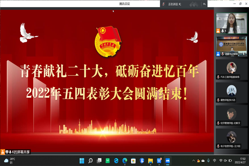 4月27日下午,在共青团建团100周年之际,学校2022年“五四”表彰大会通过腾讯会议线上开展。学校共青团各级基层组织负责人、获奖师生代表、及学生代表近400人参加线上表彰大会。