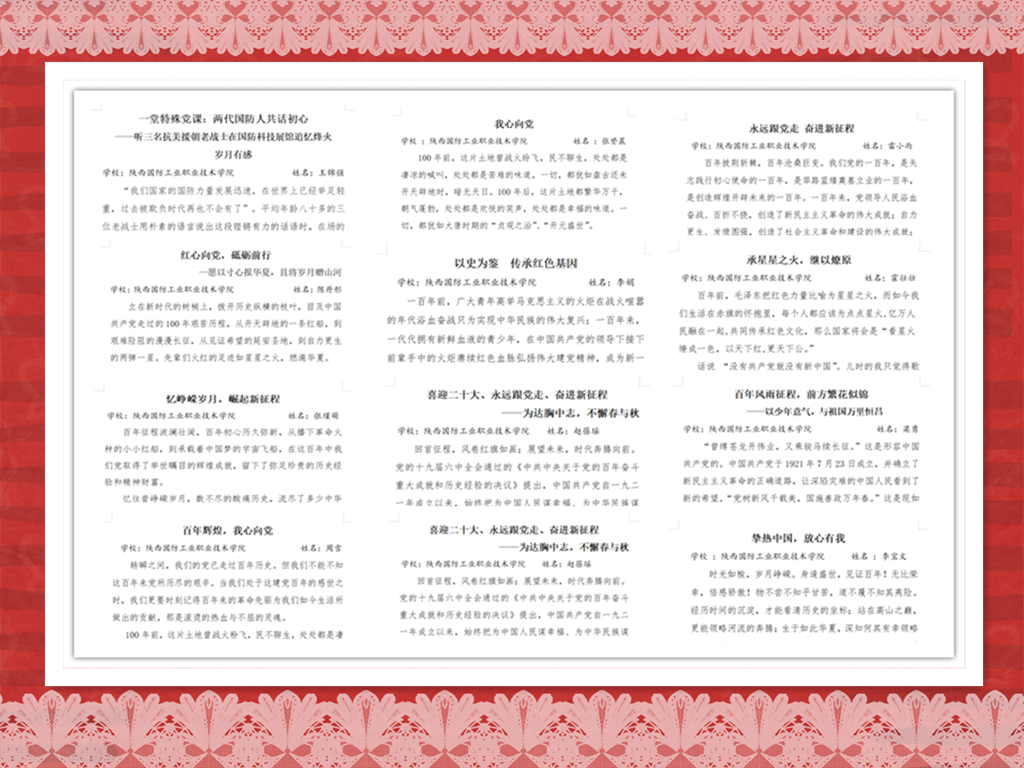 征文比赛通知下发后,全校同学们热情高昂、积极参加踊跃投稿。大赛共收到参赛作品456篇。经过资格审查、网络查重、专家评审等环节,组委会对参赛征文从主题内容、语言文采、创意升华三个方面进行评分,评选出一等奖2名、二等奖4名、三等奖6名和优秀奖若干名。同学们以鲜活的文字,展现了作为中国青年的时代朝气,抒发了赤诚的爱国情怀,在校园内掀起了一股传承红色精神、红色意志的文化热潮,营造了良好的红色校园文化氛围。