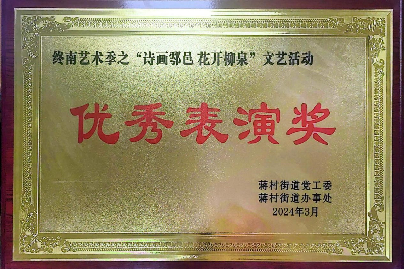 演出结束后,蒋村街道党工委、蒋村街道办事处为我校颁发了终南艺术季“诗画鄠邑·花开柳泉”文艺活动优秀表演奖牌。本次桃花节文艺演出圆满成功,后续,学校将继续发挥地方院校作用,以文化艺术积极助力乡村振兴和建设。