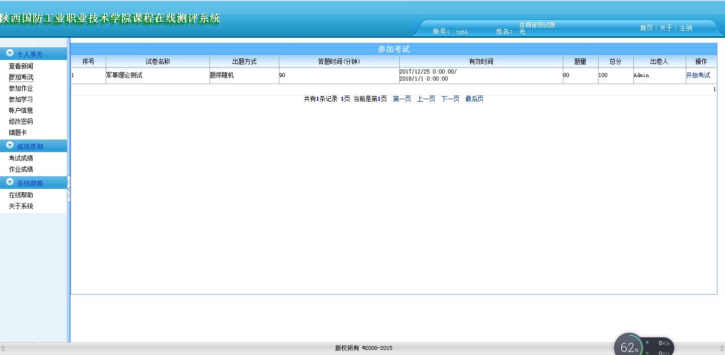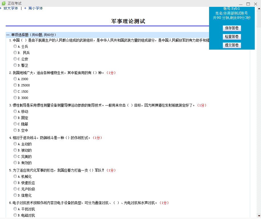 点击参加考试,即开始答题考试。考试时间设定为90分钟,单选60题,每题1分,多选20题,每题2分,考试时间结束后系统会自动停止答题,并提交显示成绩。