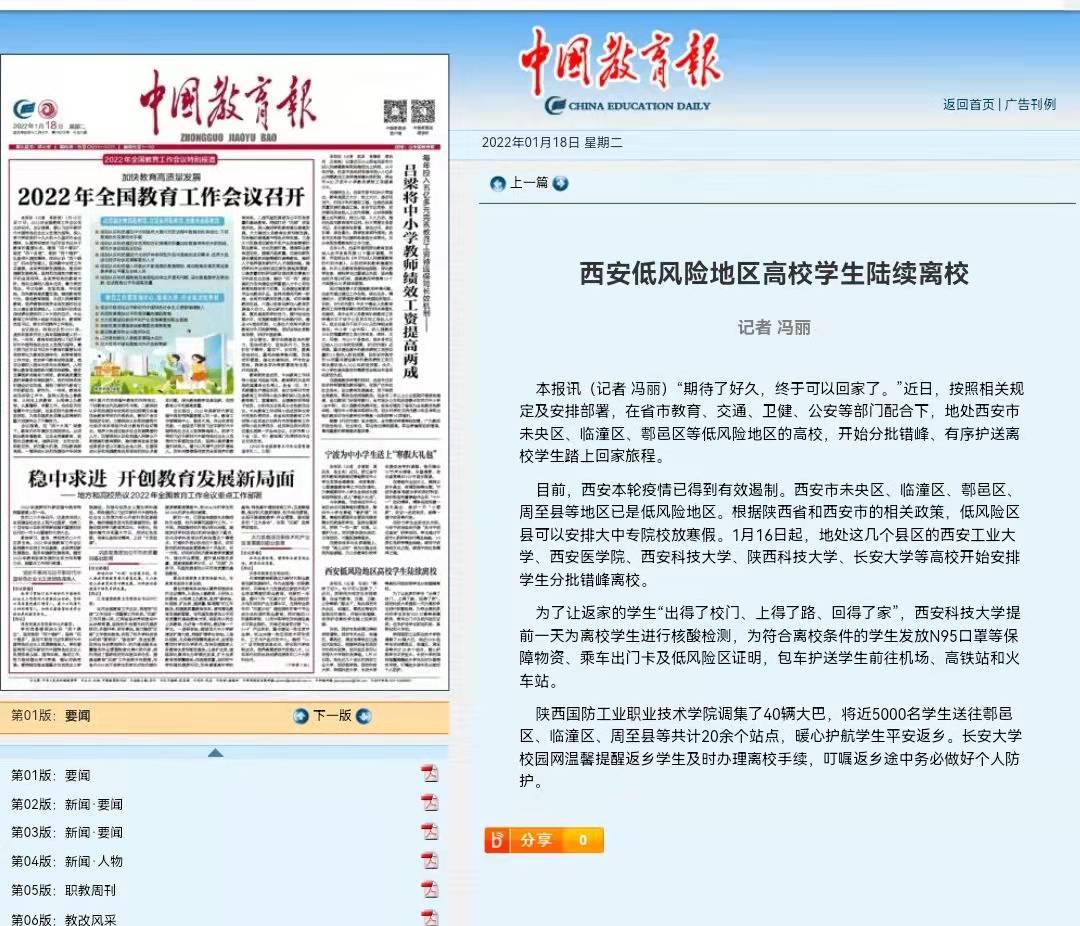 目前,西安本轮疫情已得到有效遏制。西安市未央区、临潼区、鄠邑区、周至县等地区已是低风险地区。根据陕西省和西安市的相关政策,低风险区县可以安排大中专院校放寒假。1月16日起,地处这几个县区的西安工业大学、西安医学院、西安科技大学、陕西科技大学、长安大学等高校开始安排学生分批错峰离校。