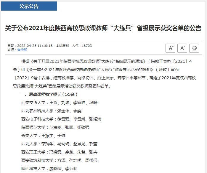 4月28日,中共陕西省委教育工委、陕西省教育厅公布了2021年度陕西高校思政课教师“大练兵”省级展示活动获奖教师名单。我校马克思主义学院教师张红斌、张贺分别荣获“思政课程教学标兵”“思政课程教学能手”,基础课部教师王宝贤荣获“课程育人教学标兵”。